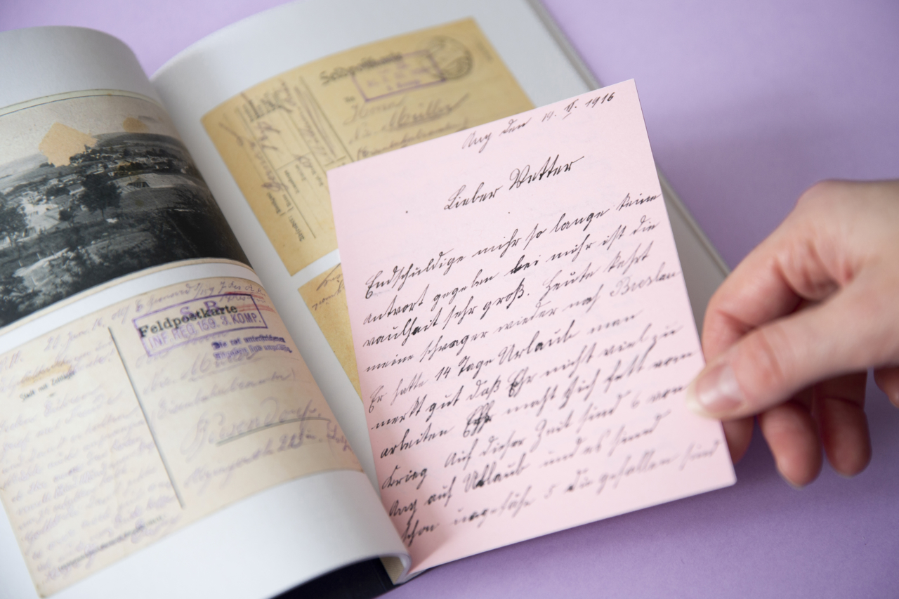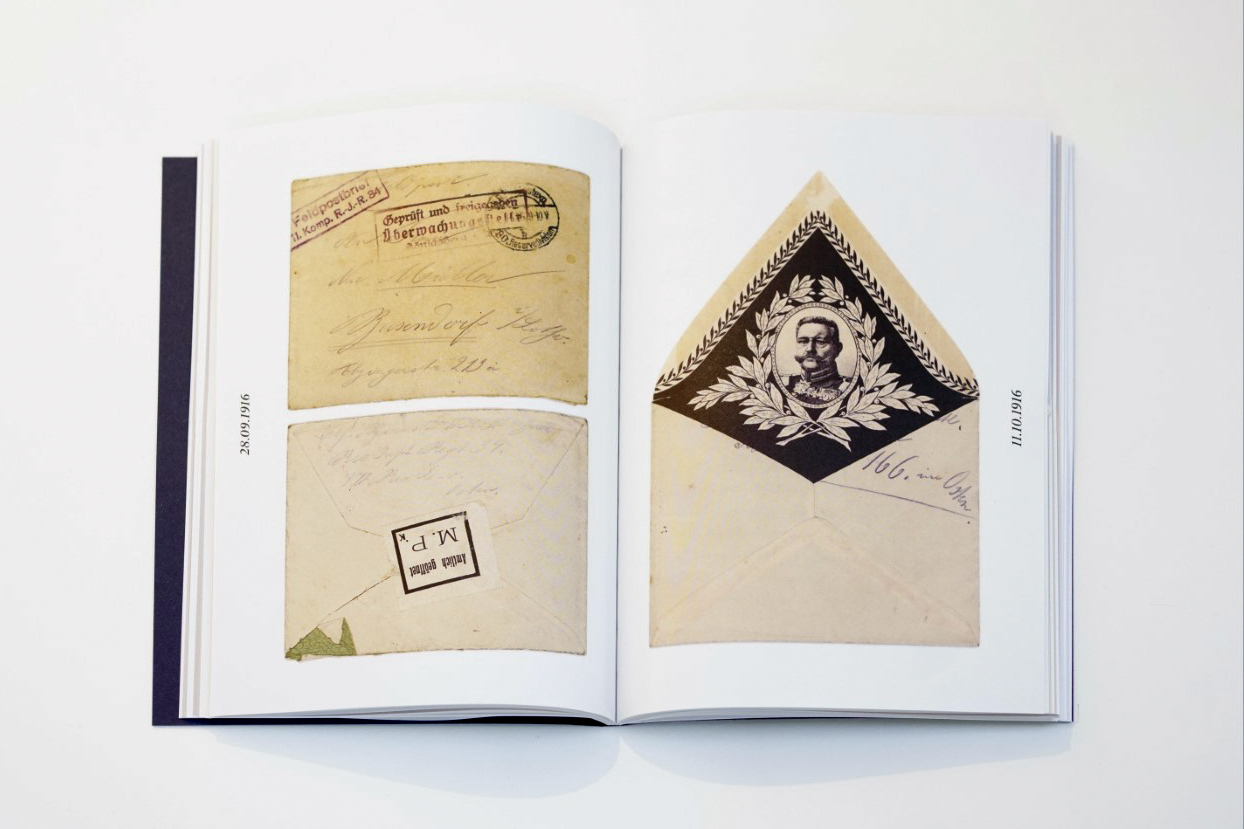 Design éditorial de l’édition « Soyez embrassés de loin » (Cyrielle Lévêque et Aurélie Michel) qui rassemble la correspondance d’Eugène Bernard, né à Luppy le 22 août 1892, pendant la période d’annexion de l’Alsace et de la Lorraine par l’Allemagne. En 1914, lorsque la guerre éclate, la Moselle est allemande depuis 43 ans et Eugène se bat sous les drapeaux du Reich. Les échanges qu’il maintient avec sa famille soulignent la singularité de la situation vécue : derrière l’apparente banalité du quotidien transpire la violence des combats et la douleur d’être séparé de sa famille, dans l’attente d’une paix qui ne vient pas.